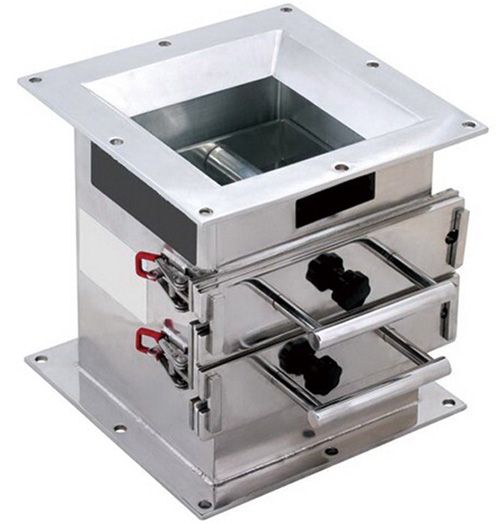 當(dāng)物料流經(jīng)抽屜式除鐵器時,其中的鐵磁性物質(zhì)被吸附到除鐵器內(nèi)部永磁磁棒上,實現(xiàn)鐵磁性物質(zhì)與物料的分離,主要應(yīng)用于干法除鐵。