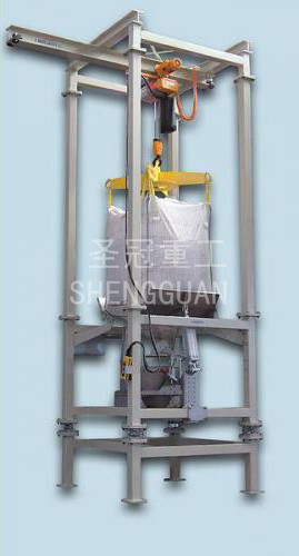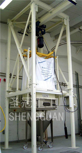 SG噸袋拆包機(jī)是通過叉車或電動葫蘆提升料袋至進(jìn)料口,進(jìn)行壓袋,人工將包裝袋下料口拆開后,打開流量控制閥和附帶的振動或拍打裝置,促使包裝袋內(nèi)的物料通過自重落到下方料斗中。