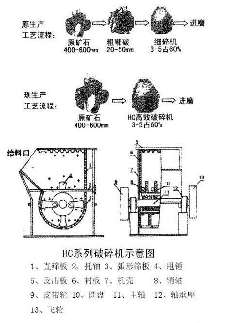 HC高效節(jié)能破碎機(jī)是我公司工程技術(shù)人員經(jīng)過反復(fù)實踐與探索研制出的 種新型產(chǎn)品,它廣泛適用于石料廠。人工砂和水泥生料原料破碎,尤其適宜對石灰石、白云石、頁巖、石膏礦、熒石、煤矸石等中硬脆性物料,進(jìn)料粒度大、出料粒度小且均勻、并且可根據(jù)不同需要選擇和預(yù)定篩板,是礦山、水泥、建材企業(yè)比較理想的一級破碎設(shè)備。改寫了水泥生料設(shè)備工藝并減少1/3的設(shè)備投資和節(jié)省1/2的電耗,省去了大量的維修費(fèi)用。