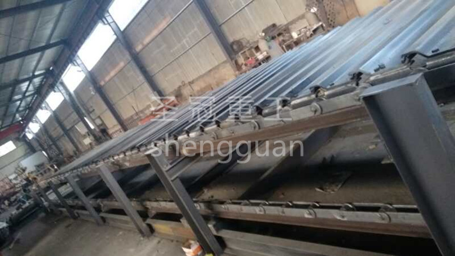 一、重型鏈板機(jī)概述: 重型鏈板機(jī)(簡(jiǎn)稱(chēng)鏈板機(jī)),是在中型板式給料機(jī)基礎(chǔ)上改進(jìn)設(shè)計(jì)的。鏈板機(jī)的主動(dòng)鏈輪與改向鏈輪之間,環(huán)繞兩條環(huán)鏈,鏈鉤與鏈板聯(lián)結(jié),鏈板兩側(cè)增加兩滾輪,物料的重量均勻壓在兩滾輪上,驅(qū)動(dòng)裝置將動(dòng)力傳至鏈輪,帶動(dòng)環(huán)鏈和鏈板運(yùn)行,達(dá)到輸送物料之目的,相比較BLQ輕型鏈板輸送機(jī)而言更適合長(zhǎng)距離輸送。 鏈板機(jī)是高溫物料輸送設(shè)備,也可用于輸送其它散狀、塊粒狀、塊狀物料,已廣泛用于建材、治金、礦山等行業(yè)的物料輸送。 二、重型鏈板機(jī)特點(diǎn): 鏈板機(jī)結(jié)構(gòu)設(shè)計(jì)合理,使用性能好,運(yùn)行阻力小,易損零件少,操作安全,維修方便,運(yùn)行可靠,使用壽命長(zhǎng)。鏈板機(jī)可水平或傾角<30°安裝,傾斜安裝時(shí),配有棘輪逆止機(jī)構(gòu)。 輸送鏈板上的輥輪在導(dǎo)軌上滾動(dòng),輸送鏈與機(jī)殼無(wú)磨擦;鏈條采用合金鋼熱處理加工制成,其正常使用壽命2年左右,運(yùn)行中故障率低。除頭尾軸承外,輸送機(jī)中無(wú)潤(rùn)滑點(diǎn)。 三、重型鏈板機(jī)主要結(jié)構(gòu): 鏈板機(jī)由頭部機(jī)架、頭部護(hù)罩、主動(dòng)鏈輪組、輸料裝置、中部機(jī)架、尾部機(jī)架、改向鏈輪組,鏈板托輪組和驅(qū)動(dòng)裝置組成。 驅(qū)動(dòng)裝置由柱銷(xiāo)聯(lián)軸器、JZQ減速機(jī)、驅(qū)動(dòng)底座組成。分右裝和左裝兩種,從機(jī)尾向輸送方向看,驅(qū)動(dòng)裝置在右側(cè)為右裝,在左側(cè)為左裝。 鏈輪采用組裝式結(jié)構(gòu),由鑄鋼鏈輪圈與鏈輪芯用螺栓聯(lián)結(jié)組合,耐磨性能強(qiáng),便于拆卸安裝。主動(dòng)鏈輪采用窩眼鏈輪圈,防止環(huán)鏈運(yùn)行中滑動(dòng)。