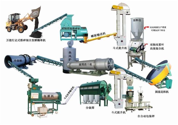 有機(jī)肥生產(chǎn)線包括發(fā)酵設(shè)備、造粒設(shè)備、粉碎設(shè)備、攪拌設(shè)備、篩分設(shè)備、冷卻設(shè)備、烘干設(shè)備、包膜設(shè)備、自動(dòng)包裝設(shè)備等工藝流程。